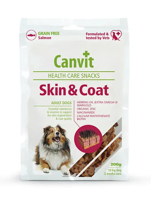 Koža a srsť sú prvou ochrannou vrstvou tela a ostatných tkanív pred vonkajším prostredím. Aby koža mohla plniť svoju ochrannú funkciu, musí mať dostatočný zdroj vitamínov, mikroprvkov a aminokyselín, ako sú biotín, vitamín B2, B3, B5, zinok a metionín pre svoj metabolizmus. Medzi ďalšie živiny dôležité pre zdravú a funkčnú pokožku patria omega-3 nenasýtené mastné kyseliny, ktoré pôsobia protizápalovo. Canvit Skin & Coat Health Care Snack poskytuje pravidelný prísun vitamínov, minerálov, omega-3 nenasýtených mastných kyselín pre zdravú kožu, lesklú a bohatú srsť a navyše vášmu psovi skvele chutí.