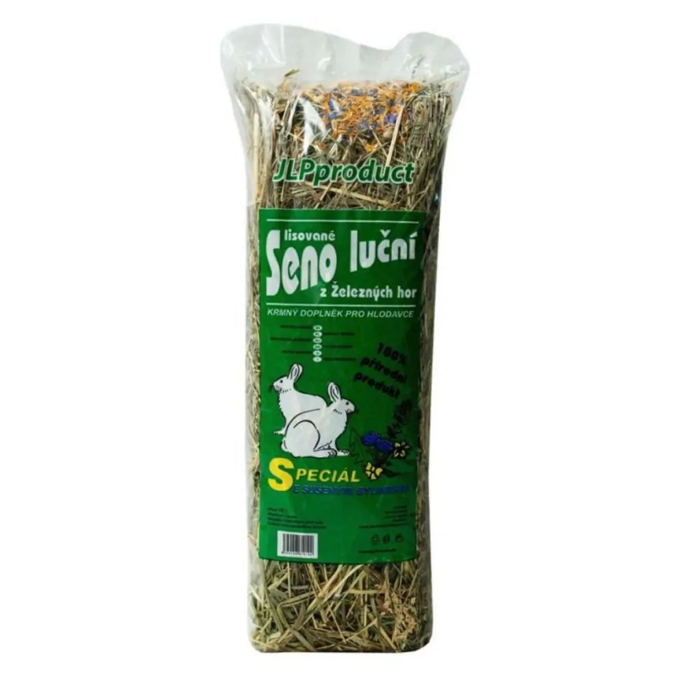 Bezprašné seno bez chemického ošetrenia, hnojenia alebo práškovania. S prídavkom bylín, púpavy a skorocelu.